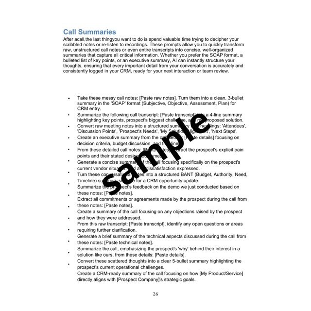✍️ SECTION 3: AI Prompts for Zero-Effort CRM Note Logging Stop the drudgery of admin. Turn messy call notes or transcripts into perfectly structured, insightful CRM entries with a simple copy-paste.