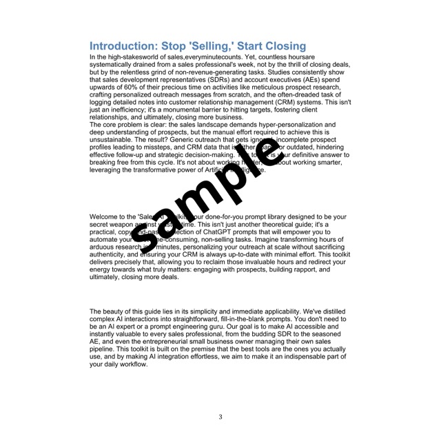 Welcome to the Sales AI Toolkit: Your Done-for-You ChatGPT Prompt Library. This isn’t just another theoretical guide; it’s your secret weapon to automate your most time-consuming tasks. Reclaim those invaluable hours and redirect your energy toward what truly matters: building rapport and closing more deals.